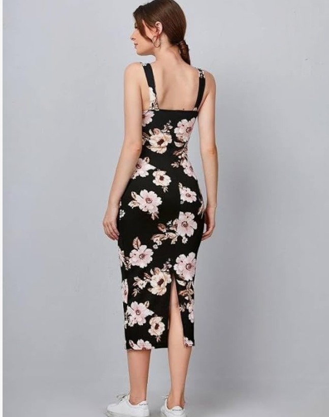Attire Empire Women’s Sleeveless Midi Dress – Elegant Black Bodycon Style with Side Slit Hem, Fitted Knee Length Design, Sophisticated Pattern Detail for Professional